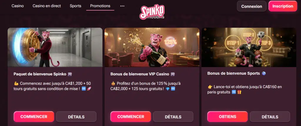 Spinko s’adresse à un public international, incluant les joueurs canadiens, et propose une interface accessible avec plusieurs langues. Le site combine :